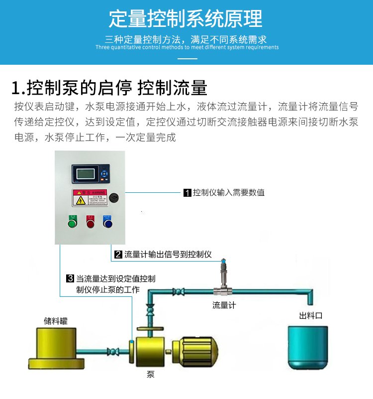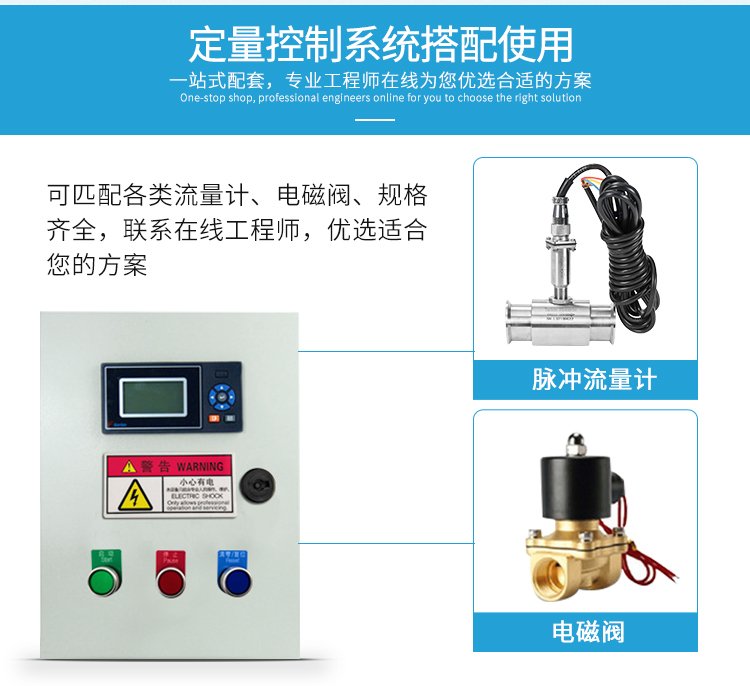/ product introduction定量控制系統(tǒng)具有體積小、重量輕、操作簡(jiǎn)單,顯示讀數(shù)直觀,清晰、可靠性高等明顯優(yōu)點(diǎn),與靶式流量計(jì)、質(zhì)量流量計(jì)、渦輪流量計(jì)、電磁流量計(jì)、渦街流量計(jì)等脈沖輸出的流量傳感器及電磁閥配套組成流量控制系統(tǒng),流量表反饋給定量控制儀的脈沖或電流流量信號(hào),當(dāng)流量累計(jì)流量達(dá)到設(shè)定的數(shù)值(定量值),定量控制儀會(huì)給電磁閥門(mén)或泵一個(gè)開(kāi)關(guān)信號(hào),已達(dá)到對(duì)閥門(mén)、泵的啟動(dòng)和關(guān)閉控制。實(shí)現(xiàn)對(duì)加料的自動(dòng)和手動(dòng)控制。該系統(tǒng)精度高,操作簡(jiǎn)單,可現(xiàn)場(chǎng)校準(zhǔn)。定量控制系統(tǒng)適用于石油、化工、醫(yī)藥、食品等行業(yè)氣體、液體的流量定量(批量)控制。