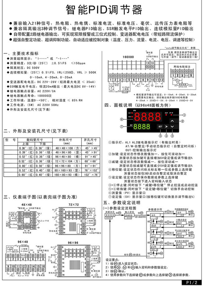 / product introduction智能PID調(diào)節(jié)器與各類傳感器、變送器配合使用,實(shí)現(xiàn)對(duì)溫度、壓力、液位、容量、力等物理量的測量顯示、智能PID調(diào)節(jié)器并配合各種執(zhí)行器對(duì)電加熱設(shè)備和電磁、電動(dòng)、氣動(dòng)閥門進(jìn)行PID調(diào)節(jié)和控制、報(bào)警控制、數(shù)據(jù)采集、記錄。